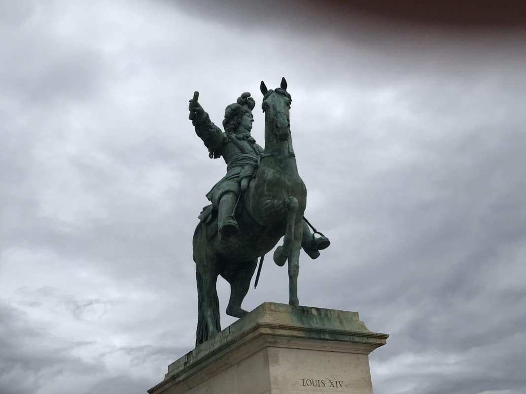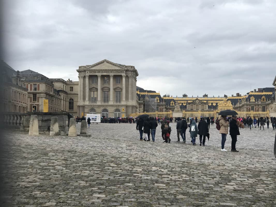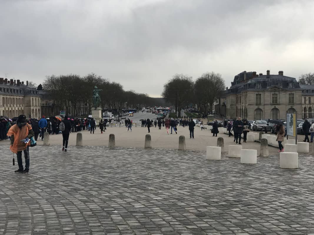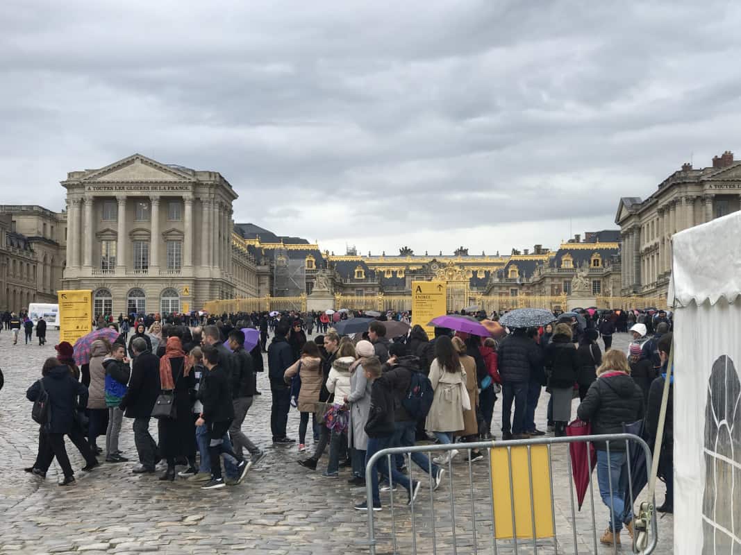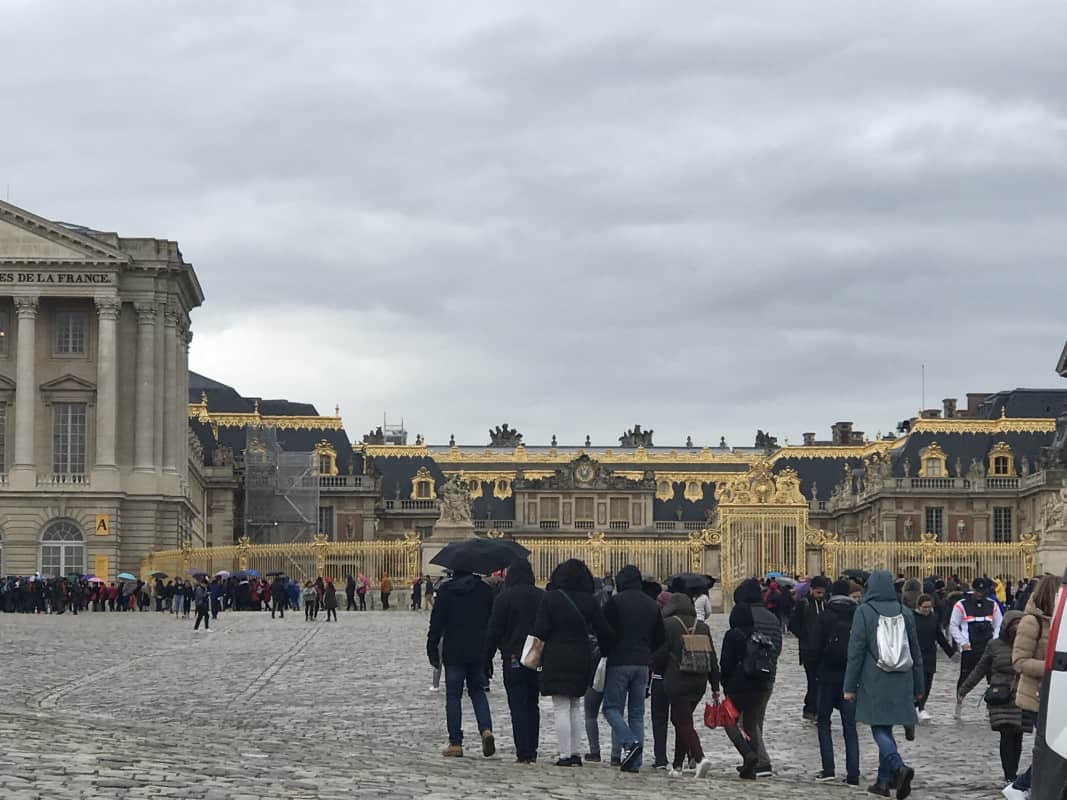 Wir starten unsere Besichtung aber einige Kilometer westwärts und besuchen das Chateau von Versailles. Wir finden rasch einen Parkplatz an der Strasse. Packen die müden Hunde und noch müderen Kinder aus dem Auto in den Regen und spazieren zum Schloss. Von Weitem ist die (Menschlen-)Schlange vor dem Schloss erkennbar und als wir näher kommen, merken wir auch schnell, dass diese Schlange kein Problem für uns darstellt. Hunde sind natürlich in Versailles nicht willkommen (nachvollziehbar!) und so genügend uns der Eindruck von Aussen durch den mächtigen, mit viel Gold verziertem Zaun.